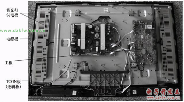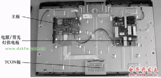 三板所示电路板结构与四板图所示的结构相比,就是利用一块电源、背光灯供电一体板取代了电源板、背光灯供电板。