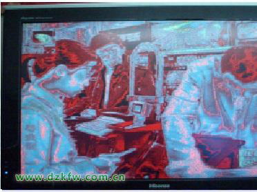 看图片,可以看到字符是正常的,就把故障压缩在显示格式变换的上游电路。从图像显示的故障现象,判断在视频解码器电路。因为,图像增强处理电路产生的故障是块状的,不是细碎的。