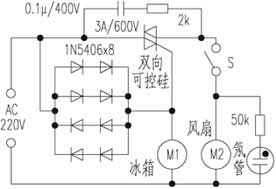 实践证明一台中意BCD-185型旧冰箱启动65分钟后就可结冰块(通常至少要120分钟)。冰箱停止运行,小风扇也自动停止。这种附加速冻电路所用元件少,全部成本不超过20元,很容易附加在冰箱电路内,按钮自锁开关S与氖管指示灯可装在箱体外部的前顶端,需要速冻时只要按下开关S,指示氖管亮,表示速冻开始。即使在使用过程所加电路元件有故障也不会影响冰箱原设计功能,也不会损坏压缩机。