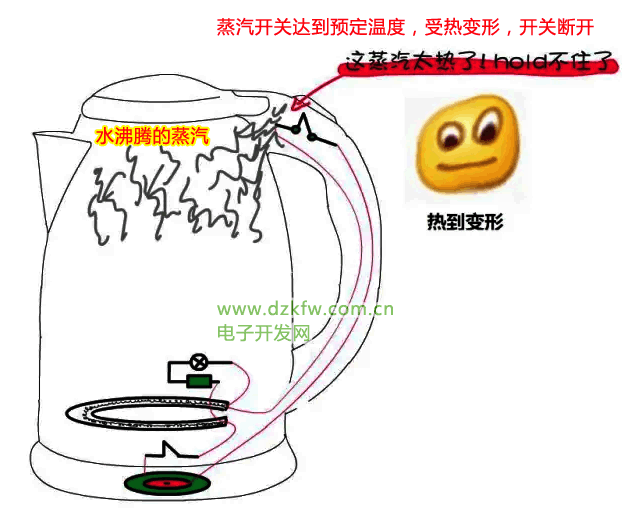 当我们按下蒸汽开关电路开始接通发热盘发热,指示灯亮水会慢慢被加热蒸汽开关内部有一个蝶形双金属片当热水壶内的水沸腾时会产生大约100℃的蒸汽蒸汽会通过管道熏到蒸汽开关蒸汽开关的蝶形双金属片就会受热发生变形从而切断电源停止加热。