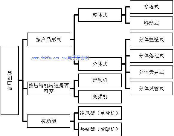 目前的家用空调基本上都采用蒸汽压缩式制冷原理,即通过对制冷剂进行抽吸压缩、冷却凝结、节流降压和吸热蒸发四个不停循环的过程,使房间空气温度下降或上升。四个过程分别在对应四个部件中完成,即制冷系统的四大件——压缩机、冷凝器、节流器件和蒸发器。