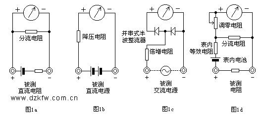 如图1c所示,因为表头是直流表,所以测量交流时,需加装一个并、串式半波整流电路,将交流进行整流变成直流后再通过表头,这样就可以根据直流电的大小来测量交流电压。扩展交流电压量程的方法与直流电压量程相似。
