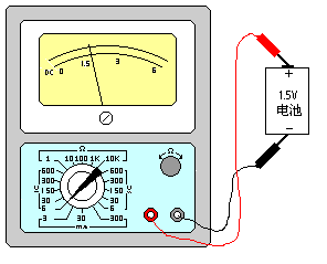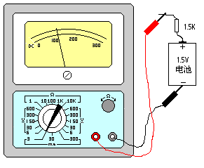 测量直流电流:--先估计一下被测电流的大小,然后将转换开关拨至合适的mA量程,再把万用表串接在电路中,如图所示。同时观察标有直流符号“DC”的刻度线,如电流量程选在3mA档,这时,应把表面刻度线上300的数字,去掉两个“0”,看成3,又依次把200、100看成是2、1,这样就可以读出被测电流数值。例如用直流3mA档测量直流电流,指针在100,则电流为1mA。