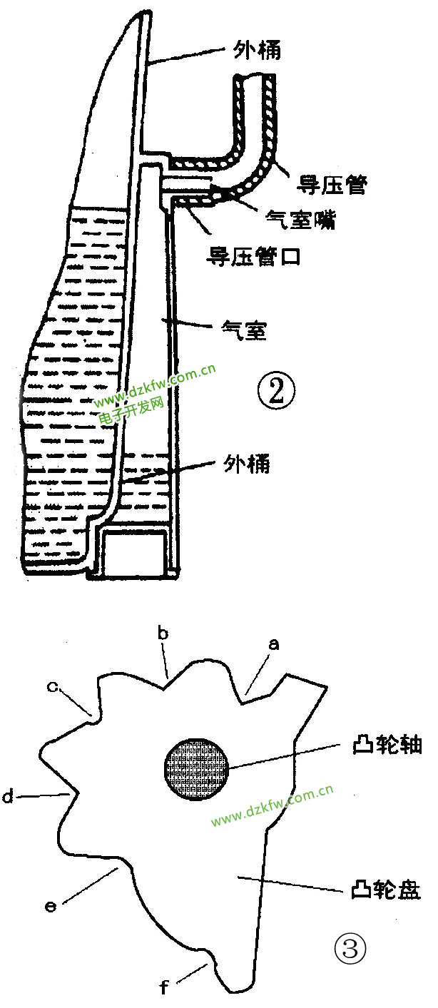 水位开关凸轮轴的顶端装有水位旋钮,用户可以通过拧动旋钮来设定水位,当凸轮轴转动时,凸轮的a,b,c,d,e,f六个点分别与杠杆接触,如图3所示。杠杆在不同位置时压力弹簧的压力也不相同,开关闭合点和复位点也不相同,因此形成高、中、低等不同的水位,同时水位开关还设置了补进水功能,若开始洗涤后,用户感觉水位不够,可以将旋钮拧到“补进水”位置,就开始补水,手松开后,停止补水。