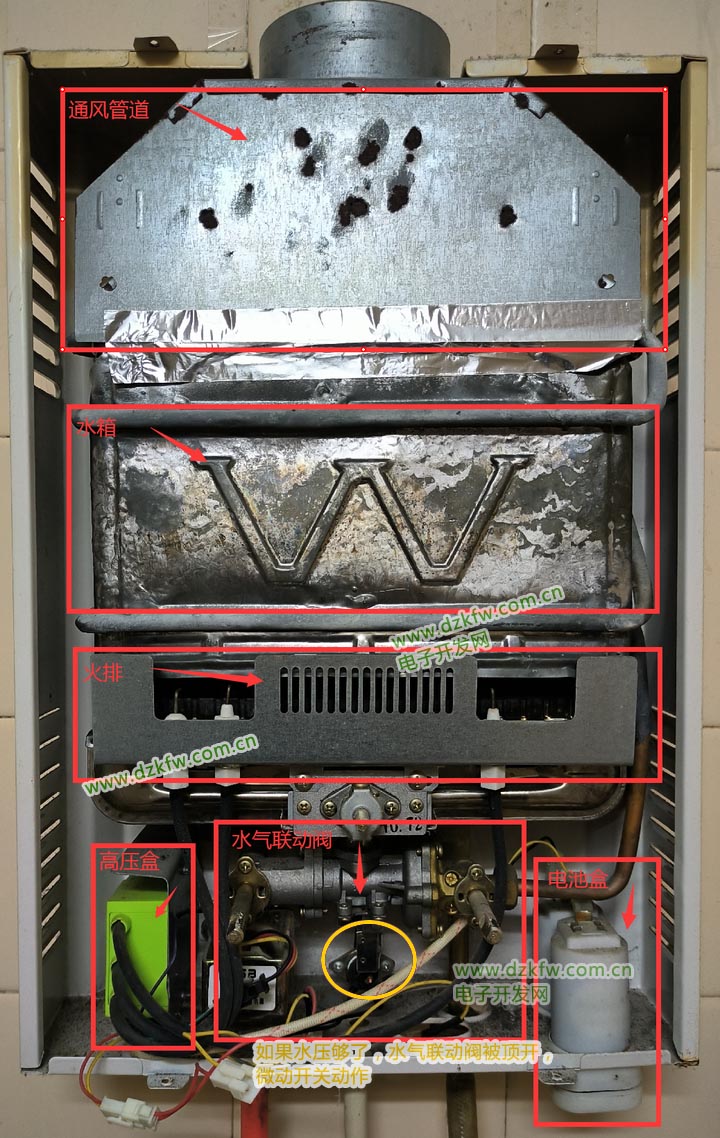 通风管道,水箱,火排,水气联动阀、点火装置