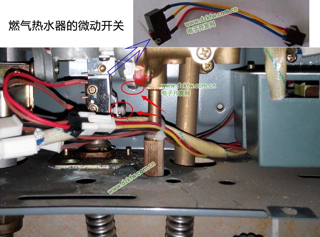 可以看到两个电线头,短接他们,如果观察到有点火,那可能是微动开关坏了,