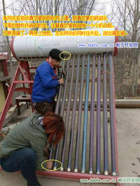 爬上房顶,先把真空管和水箱连接处的密封胶圈往下拉一节。记得用一个小瓶子装一瓶洗洁精水,用于喷射润滑橡胶圈,方便润滑真空管周围。先向左右扭动真空管的同时向上通,把真空管的底部从下面的塑料托碗中取出,注意真空管底部有一个小的凸起,不要弄破了。再往上抬起,左右转动的同时往外拉,拔出真空管。