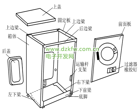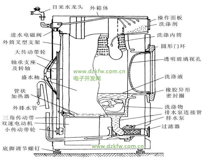 结构:洗涤、脱水系统,进、排水系统,电动机及传动系统,电气控制系统,支承机构,加热、烘干装置等。