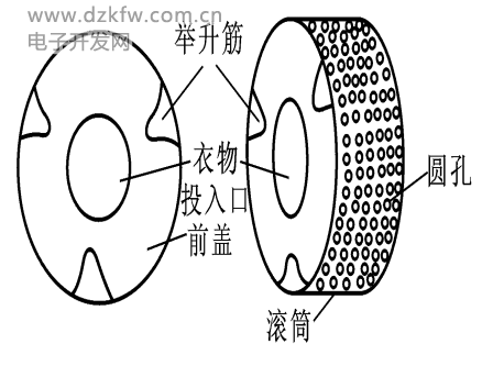 它通常都是用0.4 ~ 0.7 mm厚的不锈钢板卷制成,筒壁上布满直径为3.5 ~ 5 mm的圆孔,相邻孔之间距约15 ~ 20 mm。前盖中心开有装、取衣物用的大圆孔。滚筒内壁上有凸筋(举升筋)。如图所示。