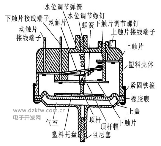 水位开关由外壳、动、静触点、橡胶膜片和气室等构成。内部有两套水位控制机构,左、右侧都能对水位进行控制。