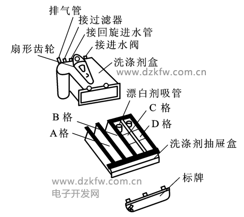 滚筒式全自动洗衣机的逆水和排水都是自动控制的。它的进、排水系统主要由水位开关、逆水电磁阀和排水泵组成。