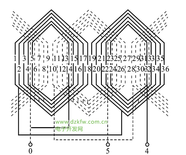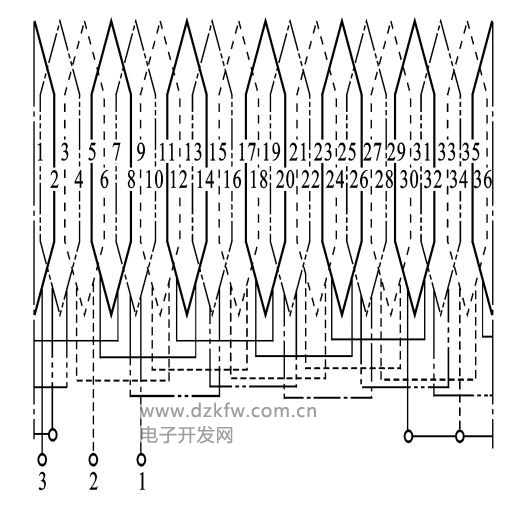 12极低速绕组由主绕组、副绕组和公共绕组组成。采用Y型接法。如图是绕组展开图,其中主、副绕组的线径和匝数相同。双速电动机共有5个绕组。