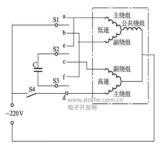 高速绕组和低速绕组使用同一个电容器。电容器的容量一般为14 ~ 20 pF,耐压值为450 V以上。