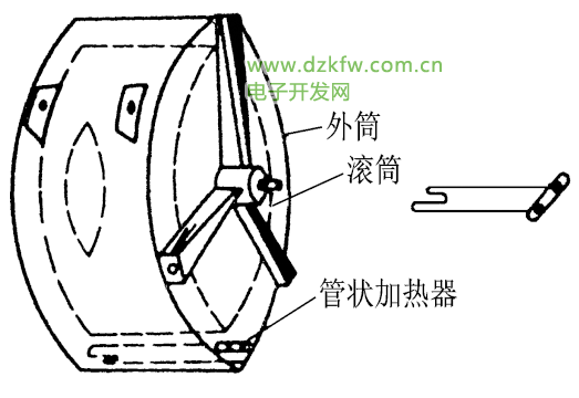 外筒两端分别有一个支撑筒体的叉形架,它由铝合金压铸成型。叉形架的中心是轴承。在轴承和叉形架部位都有密封圈。滚筒的主轴装在外筒叉形架轴承中。