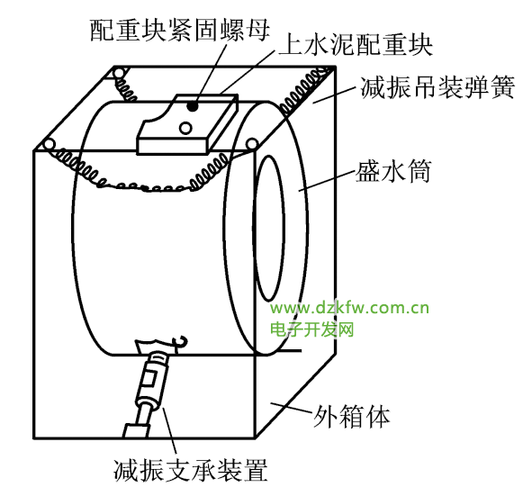 结构可分为洗涤、脱水系统,进、排水系统,电动机及传动系统,电气控制系统,支承机构及加热、烘干装置等,它的结构如图所示: