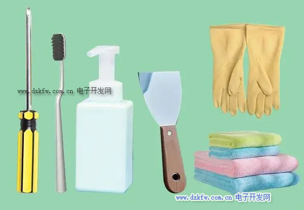 螺丝刀、软毛刷、清洁剂、干湿毛巾、橡胶手套、金属铲等。