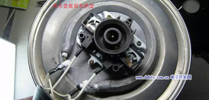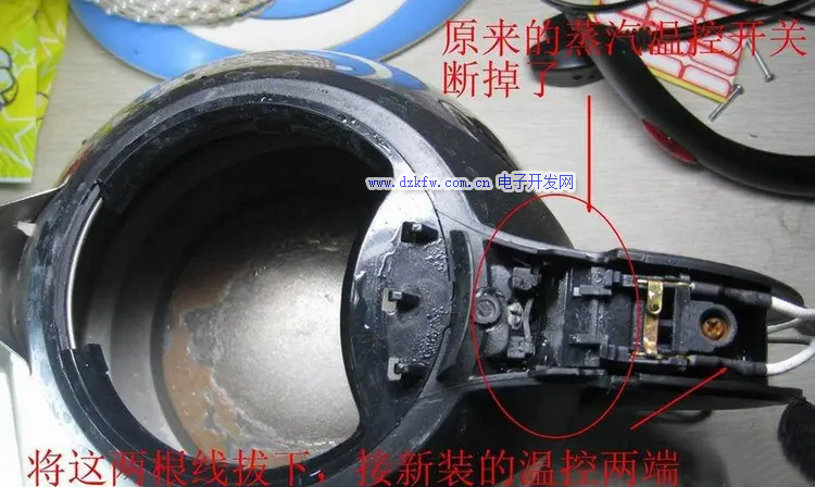 一般家用电水壶 拆开壶身底部的螺丝打开底壳,就会看到温控器被两颗螺丝固定在发热盘上把它拆下来就行了再装.上去的时候要注意对好发热盘上的定位点