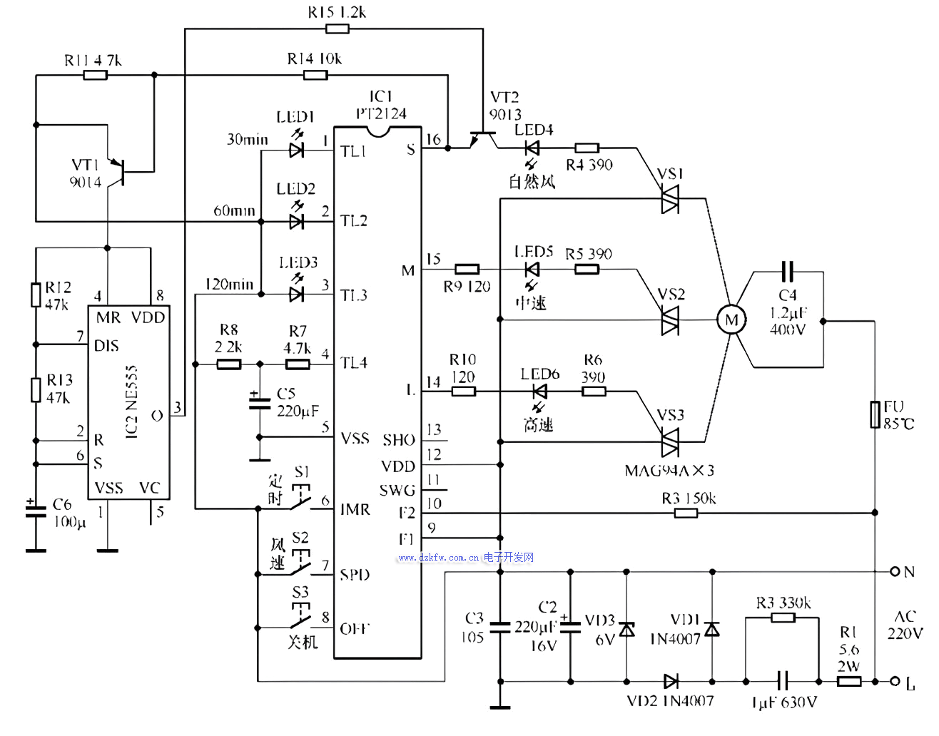 (2)功能操作电路功能操作电路由操作键 S1、S2、S3 和 IC1 共同构成。当按按键 S2 时,IC1 的⑦脚输入高电平信号,IC1 输出开机信号,使该机进入开机状态。开机后,按 S2 键,可调整风速;按S1 键,使 IC1 的⑥脚输入高电平信号后,可进入定时运行状态,每按压一次 S1 键时,定时时间会递增 30min,最大定时时间为 2h;按 S3 键,使 IC1 的⑧脚输入高电平控制信号后,IC1输出控制信号使该机停止工作。