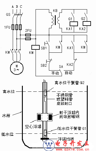图中,控制变压器380V/24V,水箱内外的控制线路用24V安全电压供电。管子用直径25毫米的薄壁不锈钢管或硬质塑料管,单端封口。