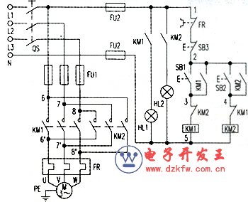 用万用表: RxlO 挡或 R × 100 挡,将两表笔分别接在图中 6 与 U 、 7 与 V 、 8 与 W 两点之间。正常情况万用表指针此时应分别指在“∞”位置。然后,测量点不变,手动交流接触器 KM1 、 KM2 ,此时,若万用表指针从无穷大位置向右偏转,说明交流接触器动作良好且主电路交流接触器主触点及热继电器热元件接线正确且情况正常。