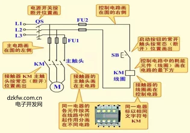 3、原理图中,同一电器的各元件不按它们的实际位置画在一起,而是按其在线路中所起作用分画在不同电路中,但它们的动作却是相互关联的,必须标以相同的文字符号。
