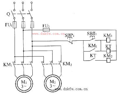 工作原理:合上电源开关Q,按下启动按钮SBTI。此时时间继电器得电,接触器KMI同时得电吸合并自锁,电动机MI先转。时间继电器KT延长一定时间后,延时闭合的常开触点KT闭合,接触器KM2得电吸合,其主触头闭合,电动机M2开始运转,电动机M1和M2保持同时运转。