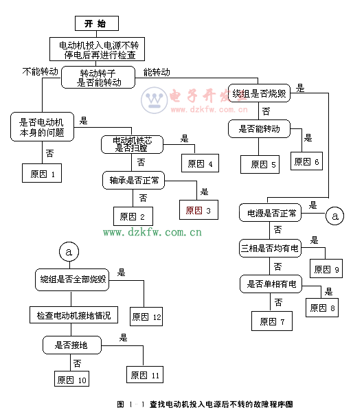 图1-1中原因5:用工具或手能够转动转子时,(http://www.dgzj.com/ 版权所有)说明不存在机械上卡住现象。这时可考虑分清是电源问题,还是绕组问题。首先检查绕组是否被烧毁,用摇表测试绕组是否接通,有无断路存在,用鼻闻和眼看是否有焦味和烧焦变色的痕迹。如果绕组未被烧毁,但又不通电,则说明是接线和断路故障,或离心开关有问题,或操作程序不对。为此要检查接线是否有松动现象,线路是否有断路,可用摇表或试灯寻查。另外要检查线路所有螺丝固定情况。