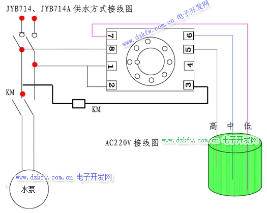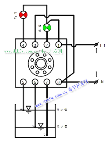 供水方式接线时,低端探头放在水池的底部,假如要把水池中的水用光后再打水,尽量可把中端探头靠近水池的底部,如需要水池中水位始终在高处,可调整中端探头的高度,高端探头为水池打水最高度的限制,当水池的水打满到高端探头时,水泵停止打水,当水池中的水用到低于中端探头时,水泵又开始打水,严禁自来水或外界无水时继电器工作,否则时间过长将烧坏水泵。