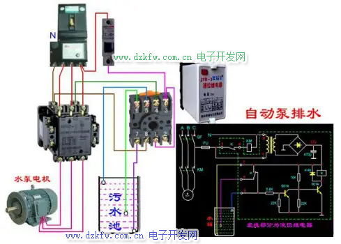 液位继电器是控制液面的继电器。这是一个继电器内部有电子线路。利用液体的导电性。当液面达到一定高度时继电器就会动作切断电源。液面低于一定位置时接通电源使水泵工作。达到自动控制的作用。自动控制由传感器和控制执行机构组成。液位控制器的传感器一般是导线。利用水的导电性。水的导电性较差,不能直接驱动继电器。所以要有电子线路将电流放大,以推动继电器工作。简化的话是这样。线分高低中三线,高为水位溢出点,自由控制水位高度,水位到此自动停止,低为点为自动加水点,水位在这个点时自动启动加水装置。中线为常触点。
