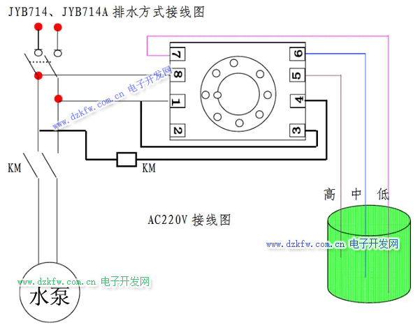 排水方式接线时,低端探头放在水池的底部,假如要把水池中的水排光,尽量可把中端探头靠近水池的底部,当外界的