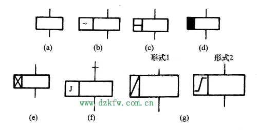 (a)继电器的一般符号;(b)交流继电器;(c)快速继电器;(d)缓放继电器;(e)缓吸继电器;(f)极化继电器;(g)剩磁继电器