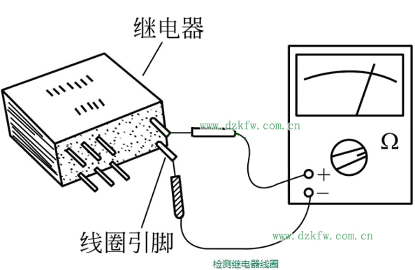 将万用表置于“Rx100”或“Rx1k”档,两表笔(不分正、负)接继电器线圈的两个引脚,测量继电器线圈的直流电阻,万用表表针指示应该与该继电器的线圈电阻基本相符。