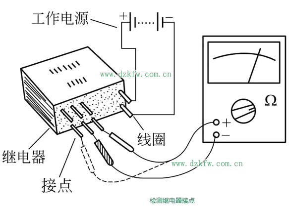 给继电器线圈接上规定的工作电压,用万用表“Rx1K”档,检测节点的通断情况。