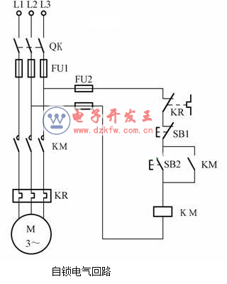 按下自复按钮开关SB2以后,接触器KM吸合。SB2复位以后,接触器KM通过自身的常开点持续吸合,这就是自锁。
