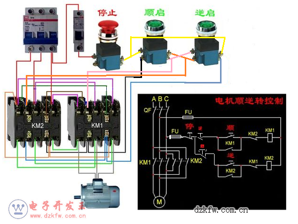交流接触器是一种用小电流的控制电路控制大电流设备的特殊开关,线圈通电时,内部铁芯吸合,带动动触点组动作,原来的常闭触点分开;原来的常开触点闭合,达到控制的目的。可以正倒转的实物接线图和原理图如图。(如果接触器不是图中的型号,接线时,要注意区分小电流的控制触点和大电流的动力触点!比如:1210或者2510等一般是控制触点在最右边。)