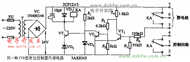 另一种JYB型液位控制器内部电路图如图11 9所示。该电路采用施密特电路(VTz、VT3组成),使液位控制器的动作可靠性进一步提高。