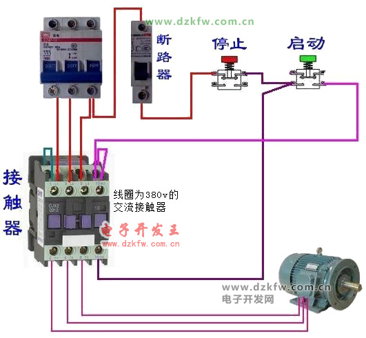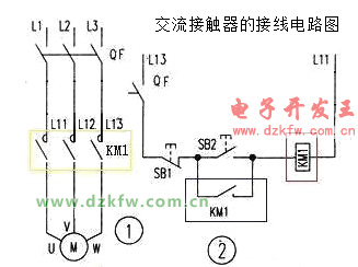 上图是用接触器控制电机的原理图,图1是主回路,图2是控制回路,图中黄色框内就是接触器的主触点,蓝色框内是接触器的辅助触点,红色框内是接触器的线圈。SB2是起动按钮,SB1是停止按钮,当按下SB2时KM1线圈得电吸合,同时蓝色框内的KM1辅助触点也闭合,松开SB2电机照常转动,按下SB1时电机停止。下图时交流接触器接线图,可以与上图对照一下。