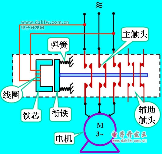 (2)触头系统,包括三组主触头和一至两组常开、常闭辅助触头,它和动铁芯是连在一起互相联动的;