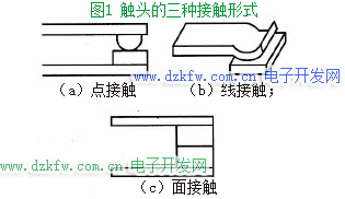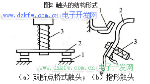 2、触头系统。交流接触器的触头按接触情况可分为点接触式、线接触式和面接触式三种,分别如图1(a)、(b)和(c)所示。按触头的结构形式划分,有桥式触头和指形触头两种,如图2所示。