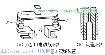 1)双断口电动力灭弧。该种灭弧装置如图3 (a)所示。这种灭弧方法是将整个电弧分割成两段,同时利用触头回路本身的电动力F把电弧向两侧拉长,使电弧热量在拉长的过程中散发、冷却而熄灭。容量较小的交流接触器,如CJ10 - 10型等,多采用这种方法灭弧。