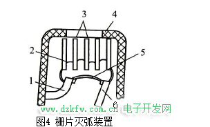 1-静触头;2-短电弧;3-灭弧栅片;4-灭弧罩;5-电弧;6-动触头