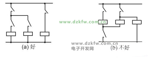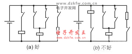1.2.5 多组触点与负载的连接:在有多组触点时,请把触点尽量排列在电源的同一极,负载在电源的另一极,如图2(a),这样可以防止触点与触点间存在电压差造成触点间短路的可能。避免象图2(b)那样接线。