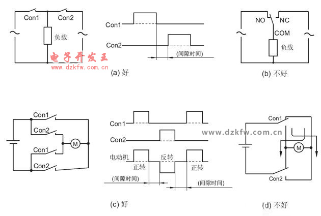 1) 一般继电器的触点间隙都比较小,应考虑到可能由于触点间电弧引起短路的情况。请不要使用图3(b)的电路。推荐使用图3(a)所示电路,并在触点Con1和Con2动作之间设定一定的间隔时间。