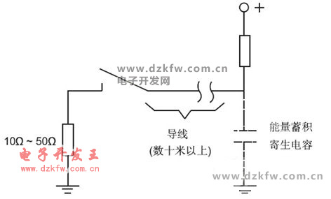 1.2.8 使用长导线时的注意点: 在继电器触点电路中,使用数十米以上的长导线时,由于导线内有寄生电容量存在,会产生冲击电流,请在触点电路上串联电阻(约10Ω ~ 50Ω),如图4。