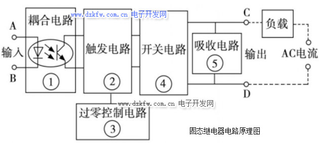 固态继电器的工作原理固态继电器(Solid State Relay,因此又称为SSR)是一种由固态电子元器件组成的新型无触点式继电器。固态继电器的开关功能通常依靠光耦、MOS管、IGBT、晶体三极管等开关元器件实现。固态继电器的本质其实就是一种具有开关性质的集成电路。固态继电器的结构如图2所示。外界给定的输入信号(高电平或者低电平)经触发电路后,控制开关元器件的通断来实现工作回路的开通与关断。