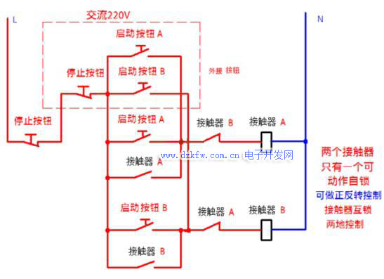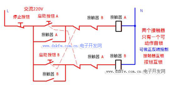 我们再分析下这个图:两个接触器是互锁的,当按钮A按下,接触器A自锁,同时接触器A的辅助常闭触点断开,所以再按下按钮B是没有反应的,只能有一个自锁,很适合用于电机正反转线路。同时正反转启动各有两组开关,可以实现异地控制。