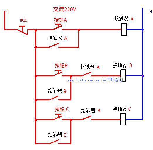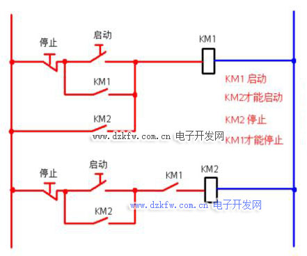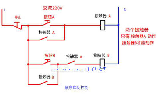 我们看图:接触器A自锁以后,接触器A的常开点变成了闭合状态,这样接触器B才可以启动。这个应用也很广泛,有的设备需要先润滑以后才能启动,就需要这种顺序启动控制。