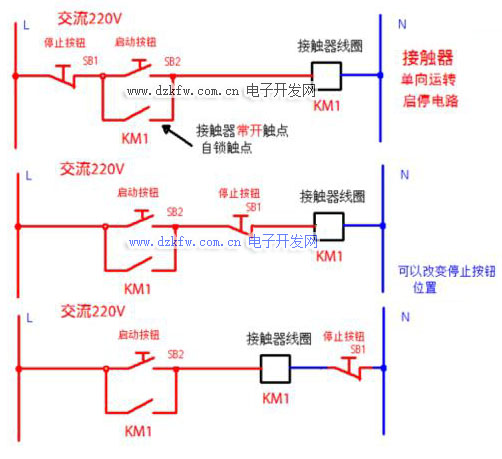 这三个自锁电路里,停止按钮的位置是不同的,但是无论怎么变换位置,记住,停止按钮肯定是串到接触器线圈上的。