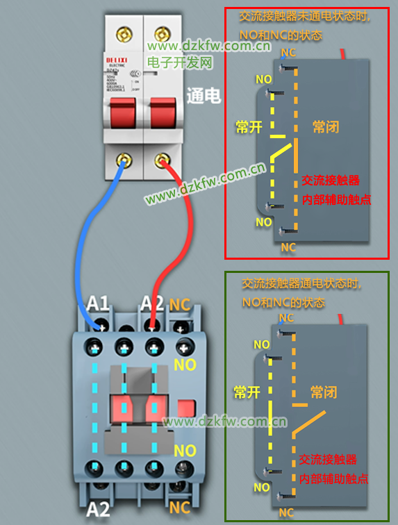 接触器线圈未通电状态,用万用表量辅助触头,通的就是常闭,不通的是常开。