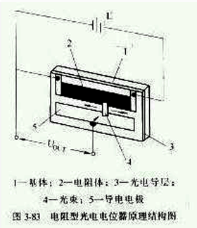 光电电位器是一种非接触式电位器。它用光束代替一般电位器上的活动触点--电刷。图3-83是一种电阻型光电电位器的原理结构图。电阻型光电电位器主要由电阻体。光电导层和导电电极等组成。光电电位器的制作过程是:先在基体上沉积一层硫化镉或硒化镉的光导电层,然后在我导电层上再沉积一条电阻体和一条导电电极。在电阻体和导电电极之间留有一个狭窄的间隙。平时无光照时。电阻体和导电电极之间由于光电导层阻值很大而呈绝缘状态。当光束照射部位和导电电极导通,于是光电电位器的输出端便有电压输出,输出电压的大小与光束位移照射到的位置有关,从而实现了将光束位移换为电压输出,输出电压的大小与光束位移照射到的位置有关,从而实现了将光束位移换为电压信号输出。